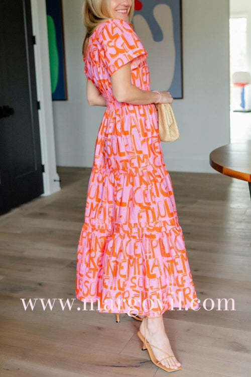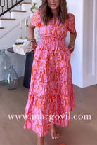 Margovil V Neck Smocked Waist Abstract Print Maxi Swing Dress