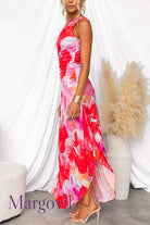 One Shoulder Sleeveless Print Asymmetric Maxi Pleated Dress