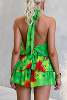 • Embrace effortless summer style with this stunning halter backless floral print ruffle romper. The delicate floral pattern brings a romantic, feminine touch, while the halter neckline and daring open back create an eye-catching silhouette perfect for warm-weather occasions. Soft ruffles add playful movement and dimension to every step. Whether you're heading to a garden party, beach getaway, or casual night out, this versatile piece transitions seamlessly from day to evening. The comfortable romper cut offers freedom of movement without sacrificing sophistication. Make a bold fashion statement with this must-have wardrobe essential that combines elegance with contemporary flair.