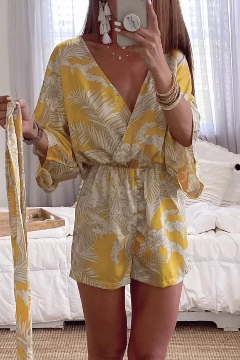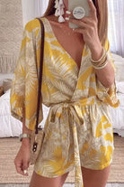 Margovil Wrap V Neck Tie Knot Leaf Print Batwing Romper