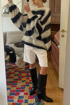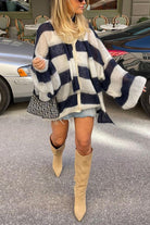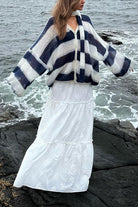 Margovil Lantern Sleeves Button Down Color Block Stripes Sweater with Scarf