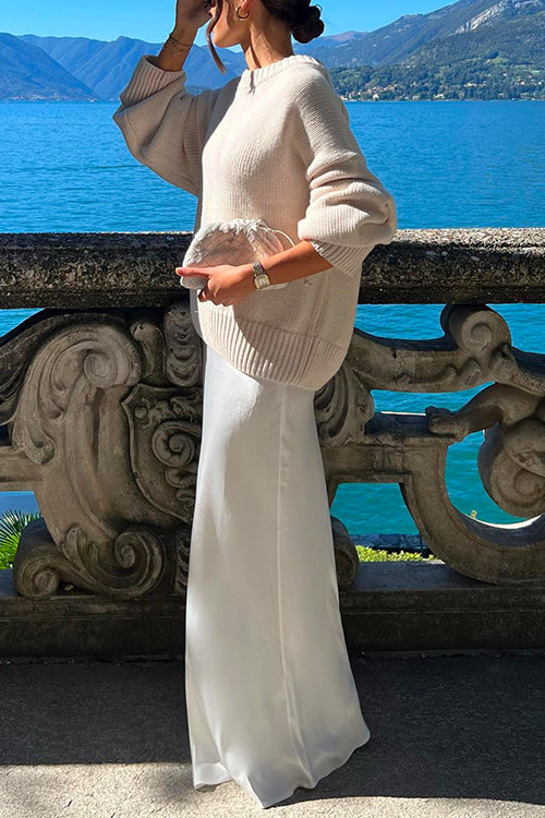 High Neck Drop Shoulder Ribbed Hem Pullover Sweater