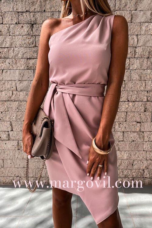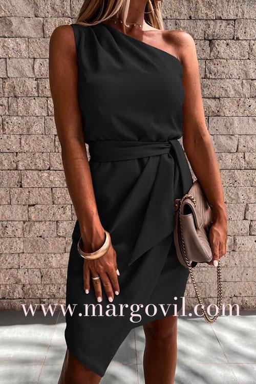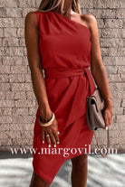 Margovil One Shoulder Sleeveless Tie Waist Ruched Dress