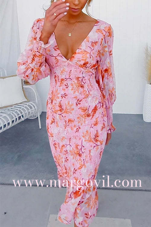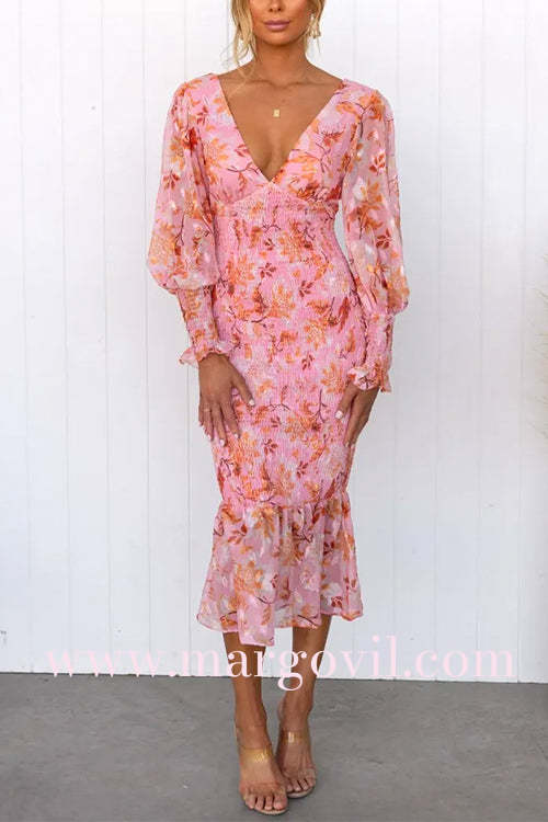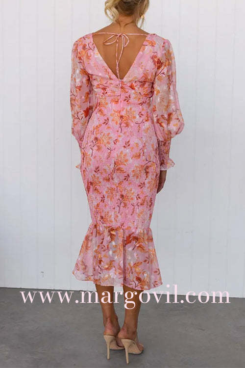 V Neck Long Sleeves Smocked Fairy Floral Mermaid Midi Dress