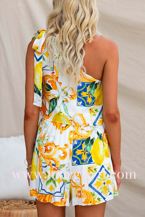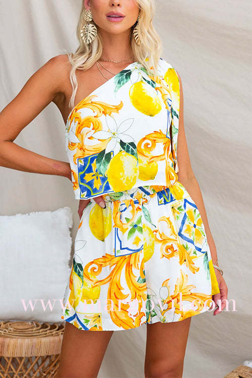 Abstract Print Bow Knot One Shoulder Crop Top Elastic Waist Shorts Set