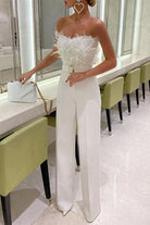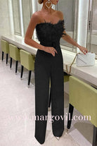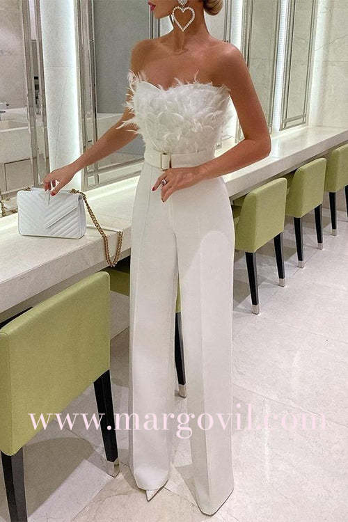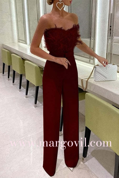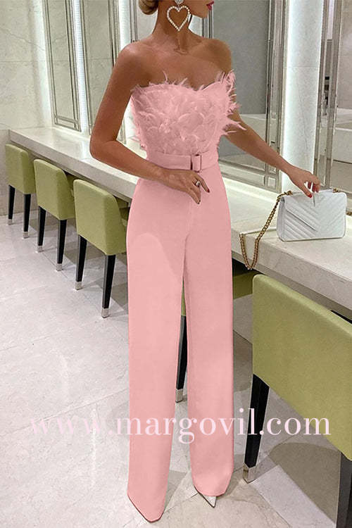 Margovil Off Shoulder Feather Splice Belted Jumpsuit