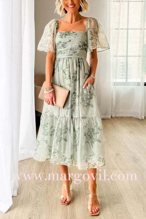 3 Colors Square Neck Short Sleeve Ruched Floral Midi Dress