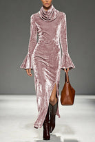 Cowl Neck Bell Long Sleeves Slit Velvet Maxi Dress