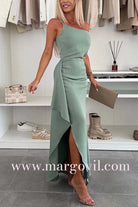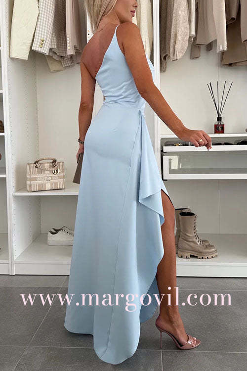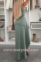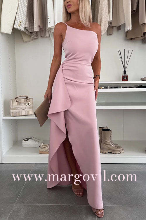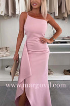 This stunning one shoulder maxi cami dress features a draped design and a stylish slit, making it the perfect choice for any special occasion. Dare to stand out and turn heads with this elegant and eye-catching dress that exudes confidence and style.