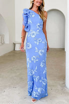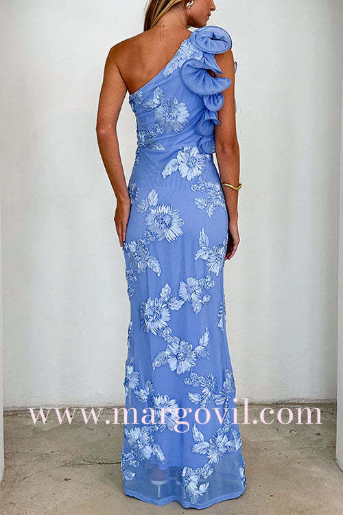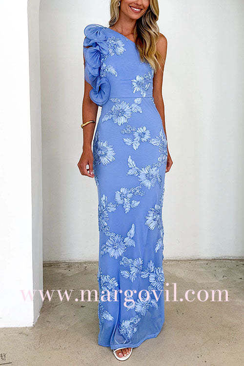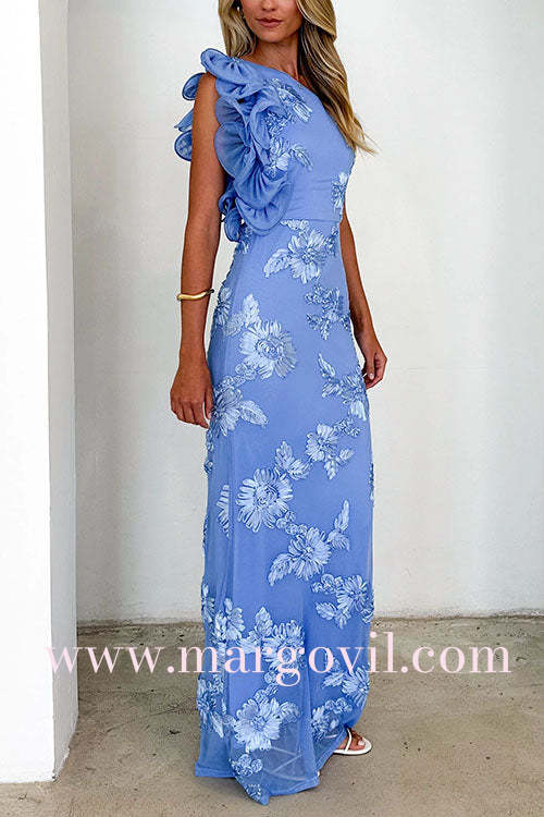 Sleeveless Ruffle One Shoulder Floral Mesh Maxi Dress