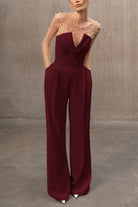 Look fabulous and feel comfortable in our V Neck Strapless Pocketed Wide Leg Jumpsuit. Featuring a flattering V-neckline and wide leg design, this jumpsuit also has convenient pockets for practicality. Make a statement at any event in this stylish and functional piece!
