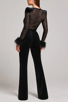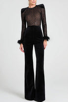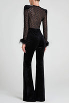 Margovil Feather Cuffs Bell Bottom Velvet Splice Jumpsuit
