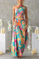 One Shoulder Cut Out Waist Pleated Maxi Print Dress
