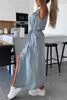 Margovil Sleeveless Button Down Tie Waist Pocketed Denim Midi Dress