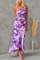 Sleeveless One Shoulder Ruched Floral Print Maxi Ruffle Dress