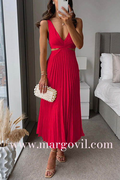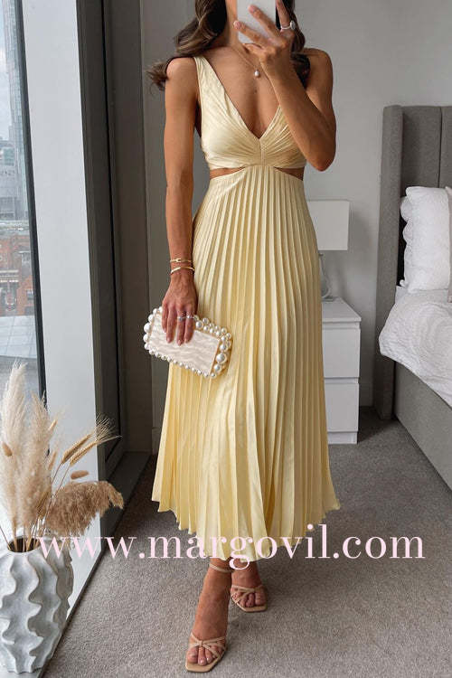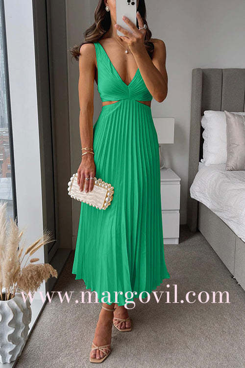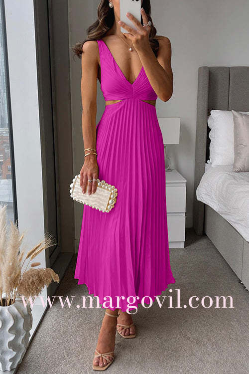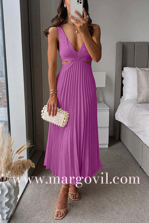 7 Colors Chicest V Neck Cut Out Waist Sleeveless Pleated Maxi Dress