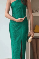 • Introducing the ultimate party dress for making a stunning entrance! Our Sleeveless One Shoulder Slit Fringe Maxi Party Dress features a stylish one shoulder design, a sexy thigh-high slit, and playful fringe details. Get ready to turn heads and dance the night away in this show-stopping dress!