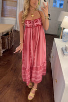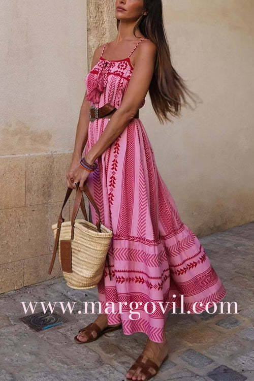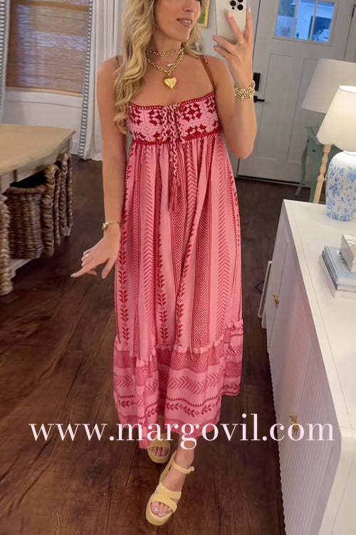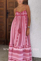 Experience bohemian charm with the Margovil Crochet Top Printed Flowy Ruffle Maxi Cami Dress. Featuring a delicate crochet top and vibrant printed fabric, this dress flows gracefully with layered ruffles for a feminine silhouette. Perfect for warm days and casual outings, it combines comfort and style to keep you looking effortlessly chic wherever you go.