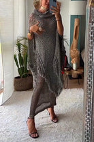 Cowl Neck Irregular Tassel Poncho Pullover Sweater