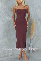 This beautiful midi dress features a strapless design that shows off your shoulders and a flirty slit that adds movement to your every step. Made from a soft and stretchy ribbed knit fabric, it hugs your curves in all the right places. Perfect for any occasion, this dress is a must-have in your wardrobe, exuding both style and comfort!