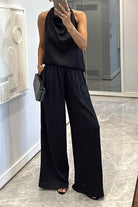 Cowl Neck Sleeveless Top and Elastic Waist Wide Leg Pants Satin Set