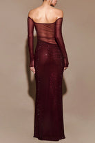 Margovil Off Shoulder Long Sleeves Mesh Splice Sequin Maxi Party Dress