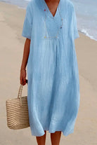 Margovil V Neck Short Sleeve Baggy Cotton Linen Midi Dress