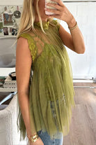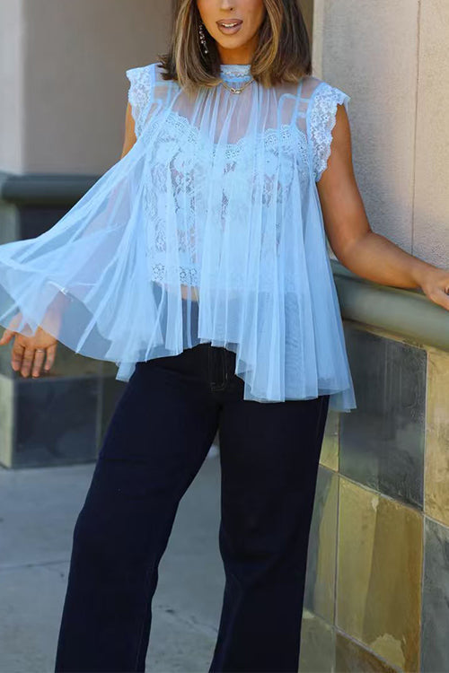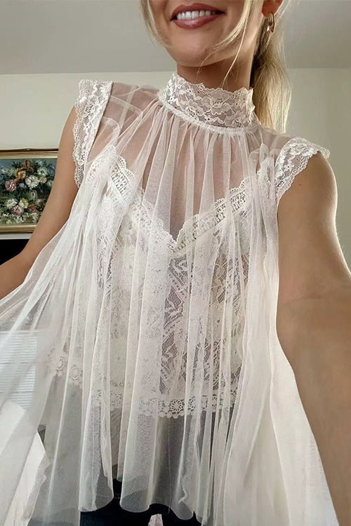 Solid Mockneck Tulle Cover Up Top with Crop Lace Camisole
