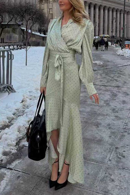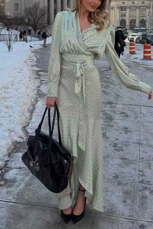 Polka Dot V Neck Puff Long Sleeves Top High Rise Ruffle Maxi Skirt Set