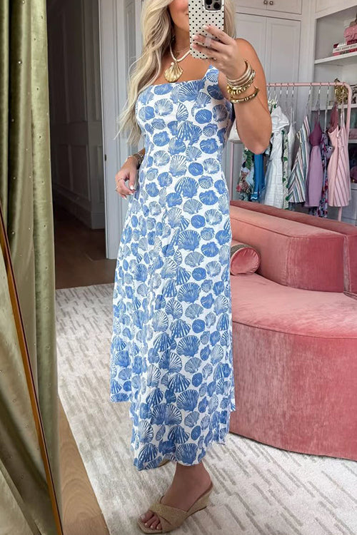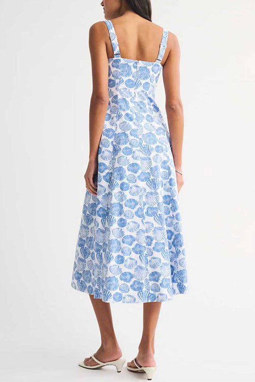Square Neck Sleeveless Shell Print Pocketed Midi Dress