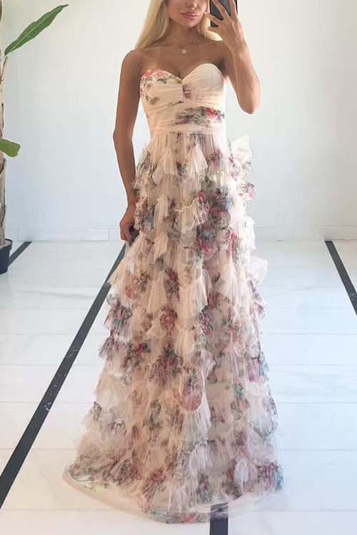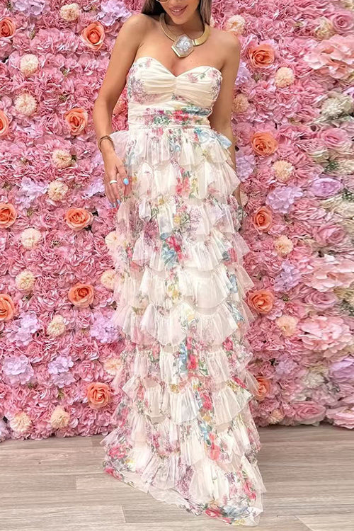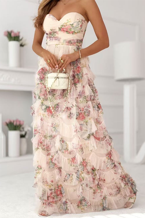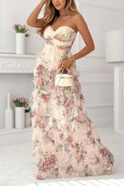 Strapless Floral Print Ruffle Layered Maxi Dress