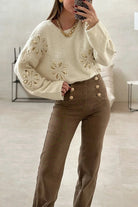 Elevate your everyday style with this irresistible crewneck knit sweater. Luxuriously soft and invitingly cozy, it's designed to become your new favorite layering piece. Eye-catching sequin flowers dance across the fabric, transforming a classic silhouette into something truly special. The timeless crewneck cut works seamlessly with any outfit¡ªdress it down with denim for weekend ease or pair it with skirts for an instantly polished look. Perfect for those who refuse to choose between comfort and style, this sweater delivers warmth, personality, and versatility in one gorgeous package. Make it yours and discover why cozy never looked so good.