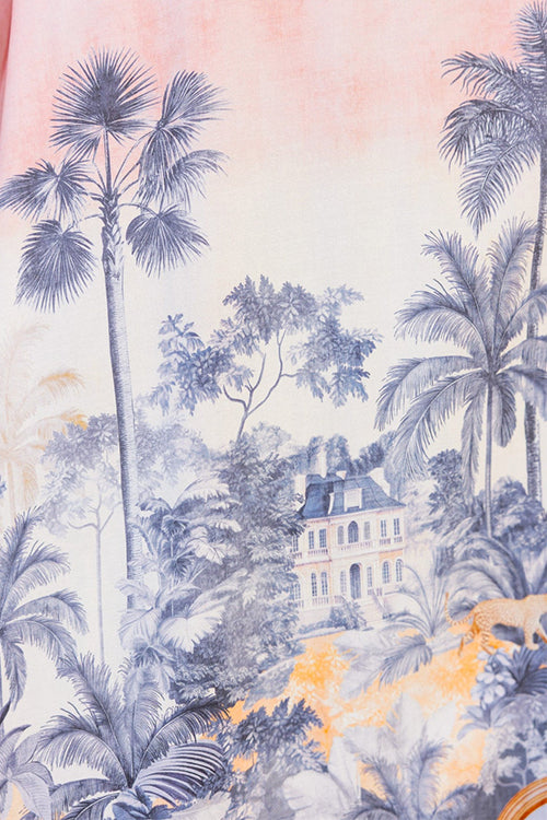 Spaghetti Strap Scenic Print Lace Trim Button Front Maxi Dress