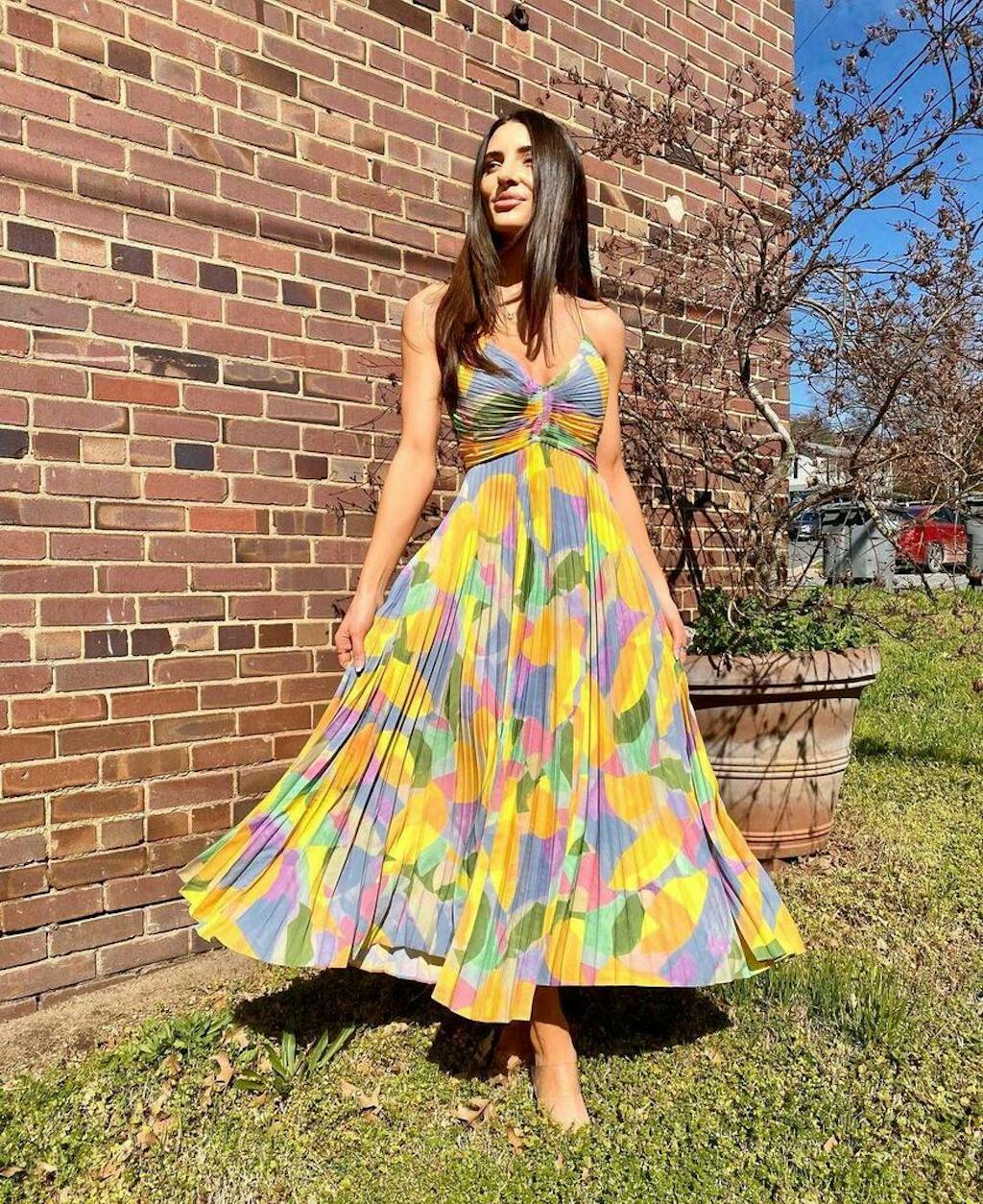 • This stunning Margovil V Neck Printed High Waist Pleated Midi Cami Dress is designed to effortlessly enhance your figure. Featuring a flattering v-neckline, playful printed pattern, and a cinched high waist, this dress will make you feel confident and stylish wherever you go. Say hello to your new favorite wardrobe staple!